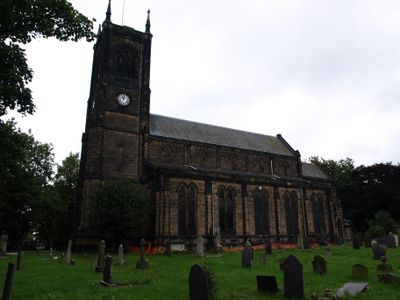 Holy Trinity Church features a stone construction with a high-pitched roof, incorporating a nave, clerestory, north and south aisles, and a west end pinnacled tower.