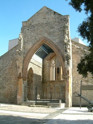 The remains of Holyrood Church feature a southwestern tower, eastern chancel, and stone walls that display 14th-century architectural elements.