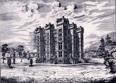 The massive square tower rose 144 feet on each side with yellow brick walls and ornamental blue Staffordshire brick decorations at Chatham Hill.