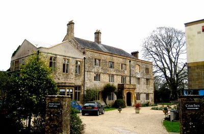 Hooke Court is a 17th-century manor house in West Dorset featuring symmetrical stone facades and traditional architectural details. The building sits at the foot of Warren Hill and now operates as an educational study center with residential facilities.