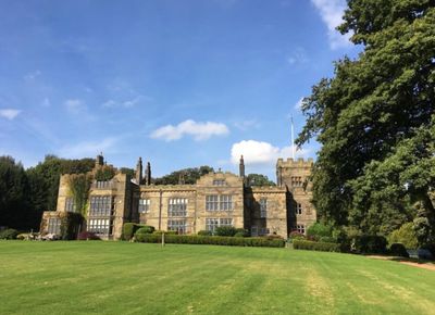 The H-shaped Huntroyde Hall features high ceilings, large windows, and a sandstone facade that reflects its 16th-century architectural origins.