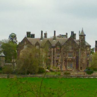 Kingston Hall stands with distinct Victorian architectural features, incorporating intricate stonework and precise geometric patterns across its exterior facade.