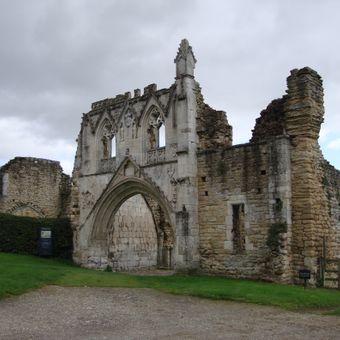 Kirkham Priory is an Augustinian monastery whose stone ruins stand beside the River Derwent, with a gatehouse displaying intricate carved reliefs and heraldic devices. The site preserves foundation walls and standing sections that reveal the layout of the original religious community.