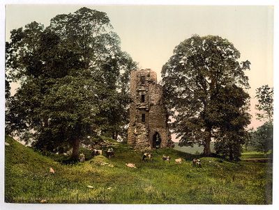The remaining 60-foot tower of Kirkoswald Castle stands against the landscape, surrounded by a wide moat and remnants of vaulted dungeons.