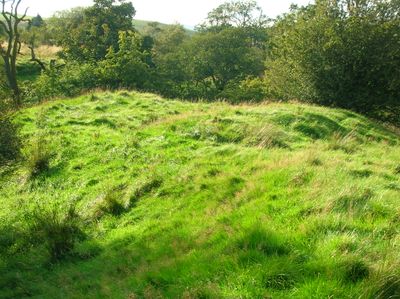 The castle site contains large earthworks and ditches along Bow Burn, with remnants of ancient apple trees and beech plantations marking its location.