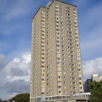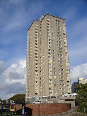 The residential tower represents the post-war architectural movement that shaped British cities through vertical housing developments in urban centers.