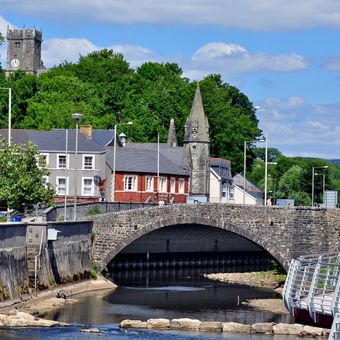 Bridgend is a market town in Bridgend County Borough, Wales, set along both sides of the River Ogmore. The center includes residential areas on the hillsides above the water, while shops, public buildings, and small parks follow the course of the riverbanks.