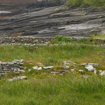 The chapel stands near Castle Bloody and Mor Stein megalithic monuments, forming part of an archaeological complex on the island.
