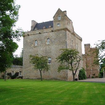 The rectangular stone structure rises amid woodlands near Haddington, featuring enlarged windows and multiple architectural additions from different periods throughout its evolution.