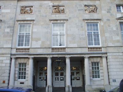 The building's first-floor windows display classical reliefs representing Wisdom, Justice, and Mercy, reflecting fundamental principles of the British legal system.
