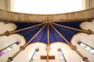 The church building, located 1.5 miles south of Edinburgh center, features stained glass windows and operates without a tower or spire structure.