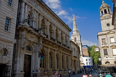 The four-story stone structure displays ornate friezes, life-size figures, and Corinthian columns across its decorated facade at numbers 53 and 55 Corn Street.