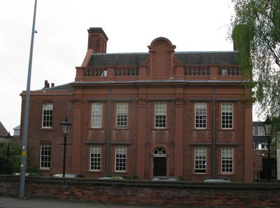 The red brick mansion on Lichfield Road features stone dressings, a balustraded parapet, and a central round arch supported by Doric columns.