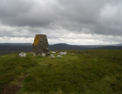 Moel y Cerrig Duon rises to 625 meters elevation within the Aran Fawddwy range, featuring a grassy summit area with a small cairn and stake marker.