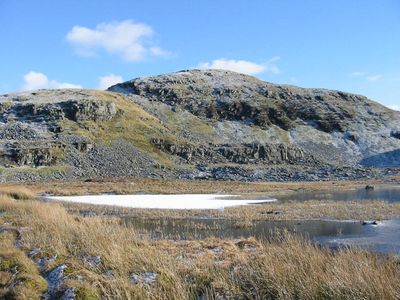The Bronze Age cairn of Bryn Cader Faner, featuring stone markers along its perimeter, lies northwest of the mountain summit in Welsh territory.