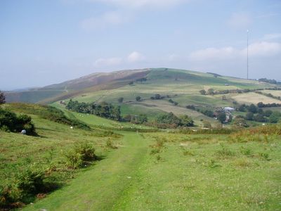 The television transmission mast at the summit serves as a regional broadcasting center, visible from considerable distances across the Welsh landscape.