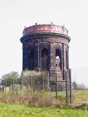The structure contains a cast iron tank at its summit with a capacity of 650,000 gallons, designed for regulating water supply to Runcorn and Liverpool.