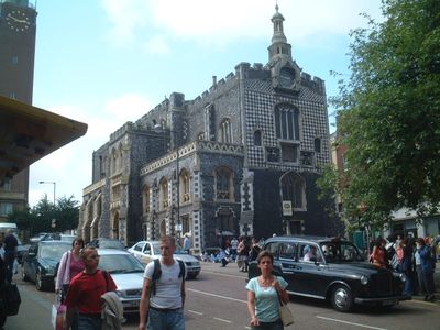 The Norwich Guildhall stands as a municipal structure with checkered flint and stone patterns adorning its eastern facade and large assembly chambers within its walls.