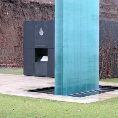The National Police Memorial consists of a glass column standing 7.4 meters high within a reflecting pool near government buildings in central London.