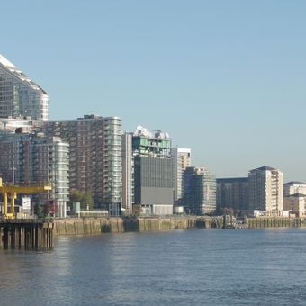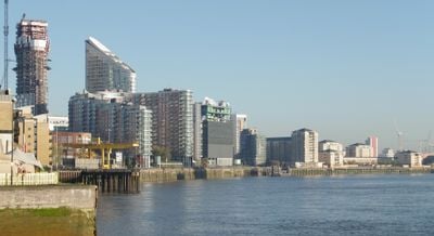 The residential development connects to central London through multiple transport links, including nearby DLR stations and the Blackwall Tunnel.