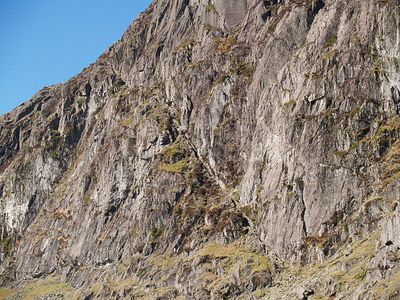 The diagonal route known as Jack's Rake cuts across the main face, providing a natural climbing passage through the steep rock formation.