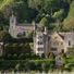 The manor includes formal terraced gardens with ancient yew trees, traditional buildings, and several historic cottages spread across the landscaped grounds.