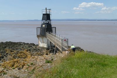 Access to the lighthouse comes via steps beside the open-air pool and Lido Café, with public seating available for viewing the Welsh coastline.