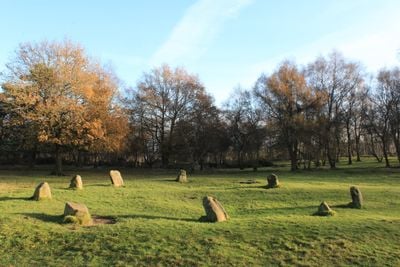 The stone circle measures 11 meters in diameter and contains ten millstone grit stones arranged in a circular pattern on elevated ground.