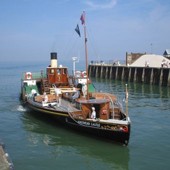 The PS Kingswear Castle is a coal-fired paddle steamer based in Dartmouth that still operates river cruises today. The vessel is roughly 27 meters long and carries passengers on regular trips along the river, maintaining its original steam engines and mechanical systems.