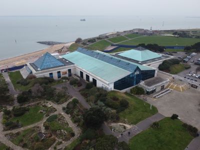 The Portsmouth Pyramids Centre spans multiple floors containing a leisure pool, fitness facilities, and entertainment areas near Southsea Beach.