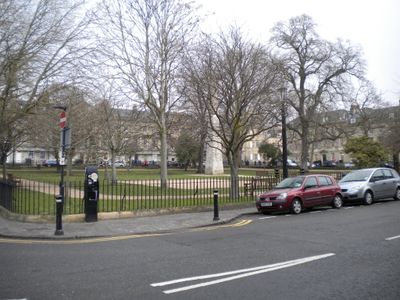 Queen Square is a Georgian square in Bath featuring a row of townhouses arranged in a rectangular formation with classical architectural details and proportions. A central obelisk monument marks the middle of the space, creating a formal focal point within this ordered composition.
