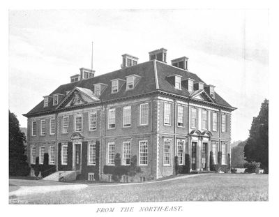 Ramsbury Manor is a two-story brick house with nine window bays across its front and a hipped roof that catches the eye. The building features sash windows with 24 panes and stone trim throughout, sitting within a sprawling landscape park of some 62 hectares.