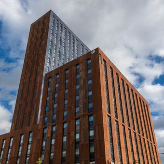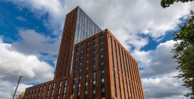 The tower houses 793 students from Manchester universities, creating a vertical community that reflects the city's strong educational foundation.