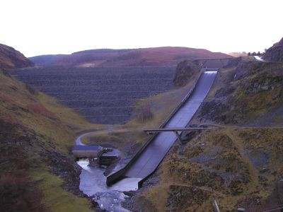 The spillway of Llyn Brianne, standing at 91 meters, makes it the highest dam in the United Kingdom with an integrated hydroelectric station.