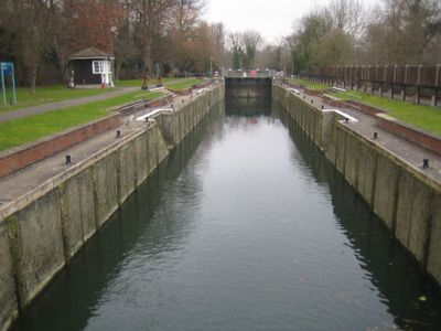 Romney Lock is a navigation lock on the River Thames near Windsor that controls water flow and allows boats to pass through. The structure sits beside a boatyard and Romney Island, roughly half a mile downstream from Windsor Bridge.