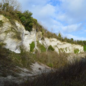 Located on the southern flank of the Hog's Back, this 1.2-hectare chalk pit reveals distinct layers of sedimentary rock formations and geological structures.