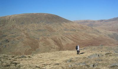 The mountain forms part of the established walking routes in the Lake District, marked by a summit cairn that connects to neighboring peaks.