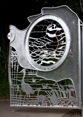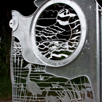 Artist Tim Tolkien created the entrance gates, integrating artistic elements into the natural setting of the Royal Society for the Protection of Birds reserve.