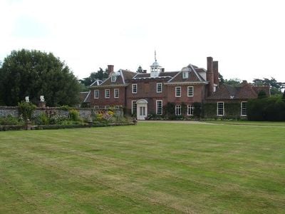 The property contains maintained gardens with a topiary maze, ancient trees, and ornamental designs accessed through wrought iron gates.