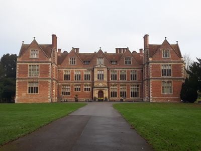 Shaw House exhibits Tudor architecture with symmetrical wings, mullioned windows, and detailed chimneys constructed from red bricks and local chalk stone.