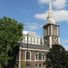 St Botolph's Aldgate is a brick church with stone quoins, window casings, and a square tower topped by an obelisk spire. The building stands at the junction of Houndsditch and Aldgate High Street.