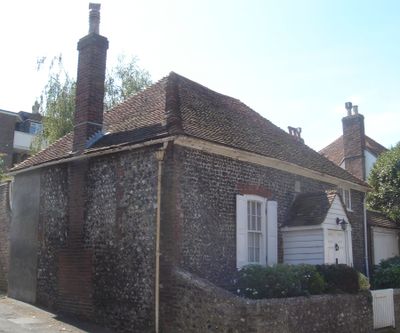 The Southover General Baptist Chapel features knapped flint walls with red brick corners and a hipped tiled roof measuring 27 feet by 17 feet.