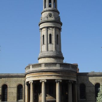Robert Smirke designed this building in the early 1820s as part of a government program creating new places of worship across London. Its completion marked a significant moment in the expansion of the city's religious infrastructure.