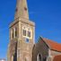 The church features an Early English style architecture with flint exterior walls, a tiled roof, and an ashlar steeple added in 1873.