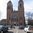 The red brick structure exhibits Romanesque Revival design with rough stone dressings, broad arches, and two prominent western towers completed in 1911.