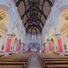 The west wall contains two large three-lancet windows with a central niche housing a figure of Jesus Christ, while the clerestory displays quatrefoil oculi.