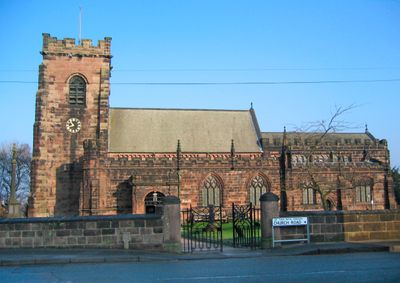 Located at Church Road in an elevated position overlooking Frodsham, the church contains Grade II listed structures including a war memorial and an 18th-century sundial.