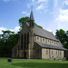 The church displays stone construction with an octagonal turret, a spire, and three tall two-light windows at the west entrance.