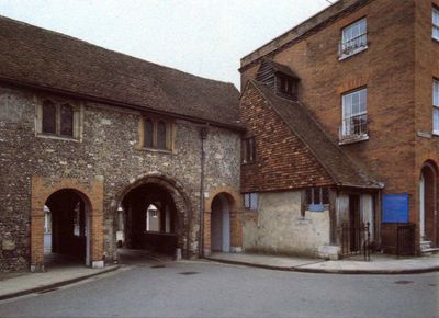 The stone church sits above one of Winchester's medieval city gates, featuring architectural elements from the English Gothic period and remnants of original stained glass windows.
