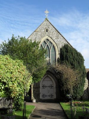 The Gothic Revival church stands along High Street in Steyning, constructed with flint walls, yellow brick details, and stone architectural elements.